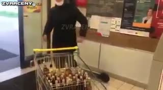 jedno z nejsmutnějších videi co sem na ynternetu vyděl ......plný nakypni košik lahví převrátil při pokusu o neobviklou přepravhu